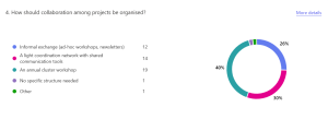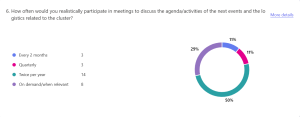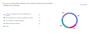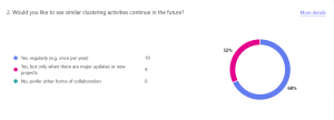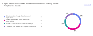 - Support for continued clustering activities: the majority of respondents (19 out of 28) vote in favour of continuing clustering activities regularly, while 24 out of 28 support creating a joint EU cluster with a shared online platform.