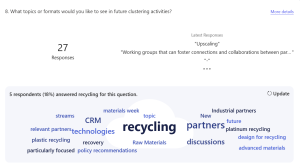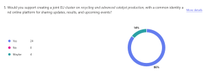 These funding mechanisms were echoed by calls for clustering beyond project coordinators. The interactive survey closing the session showed growing interest in annual workshops around the topic of catalysts and light coordination networks, with future topics including recycling, CRM technologies and balanced coverage of research and innovation.