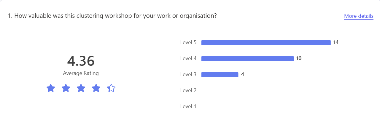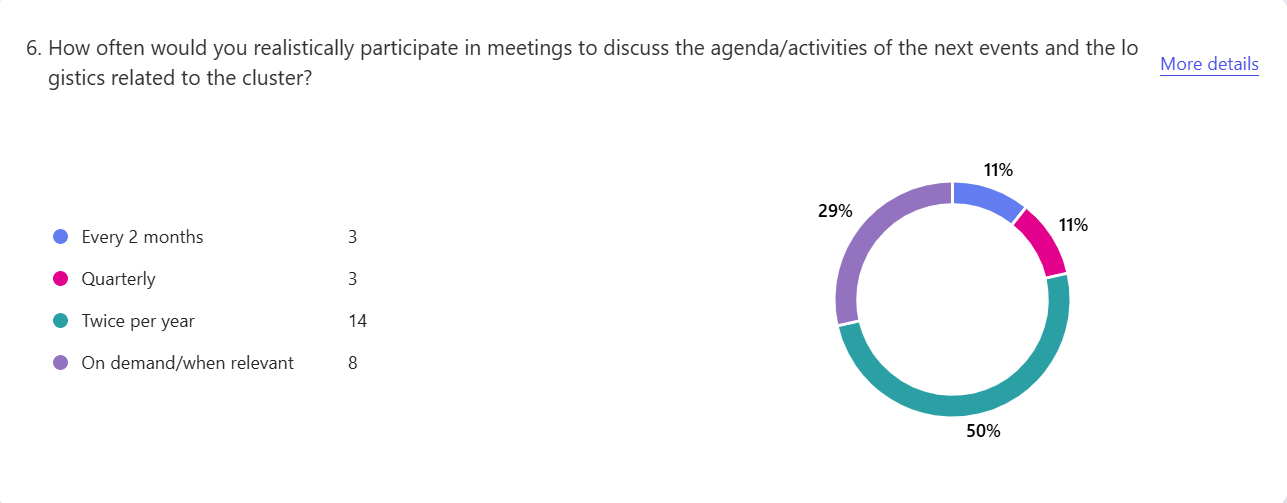 - Support for continued clustering activities: the majority of respondents (19 out of 28) vote in favour of continuing clustering activities regularly, while 24 out of 28 support creating a joint EU cluster with a shared online platform.