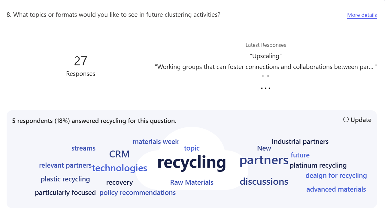 These funding mechanisms were echoed by calls for clustering beyond project coordinators. The interactive survey closing the session showed growing interest in annual workshops around the topic of catalysts and light coordination networks, with future topics including recycling, CRM technologies and balanced coverage of research and innovation.