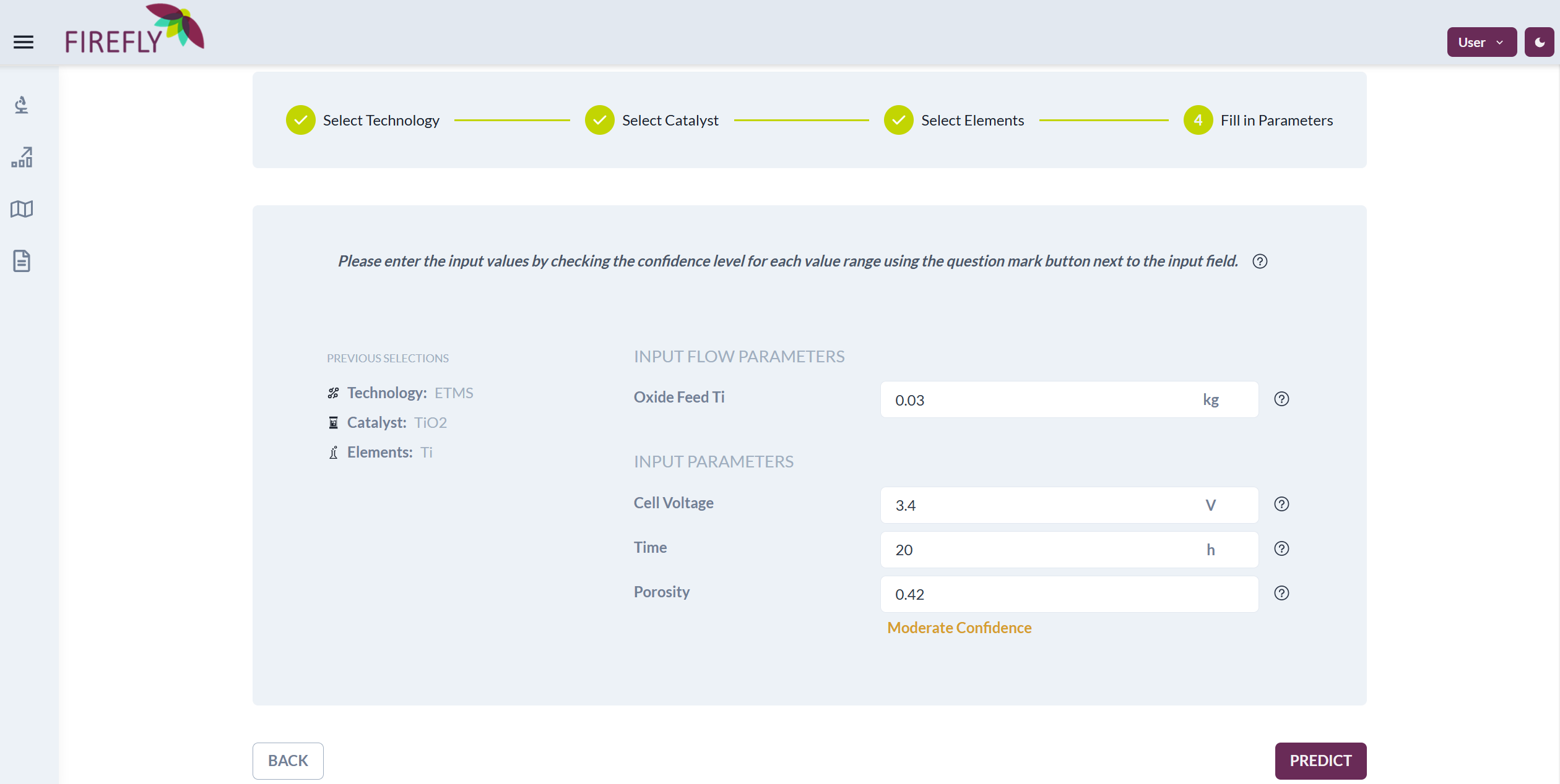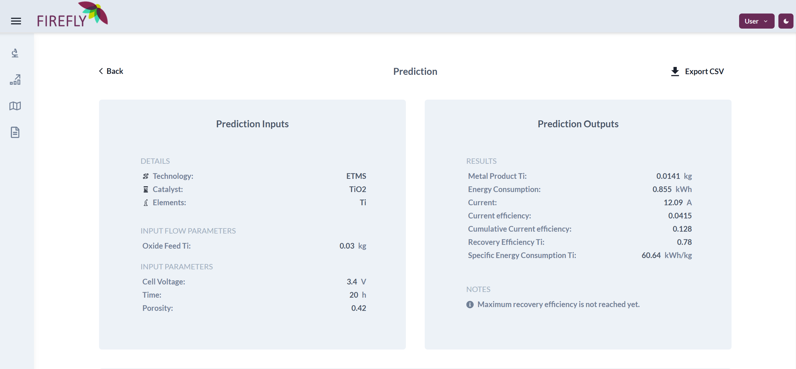 The trained ML models for the electrochemical transformation in molten salts (ETMS) on TiO2 and the gas-diffusion electrocrystallisation (GDEx) for PGMs have already been integrated on the application, with the ETMS model already available in the application. The process of training optimal ML algorithms  is computationally intensive and requires long processing times. Once the models are trained, additional post-processing corrections are applied to incorporate external knowledge into the model. This underlines the critical importance of human intervention in the optimisation phase of the dedicated ML algorithms created for these cuttingedge electrochemical processes.
